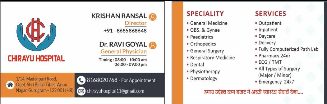 "Apni sehat ka dhyan rakhe, hamara hospital aapke liye hamesha tayyar hai. Hamare visheshagy vaidyon dwara di gayi prashikshan se bharey hue hospital mein aapko sabhi tarah ke chikitsa sevaen pradan ki jati hain. Sampoorn suvidhaon aur aadhunik upkaranon se yukt, hum aapki sehat ko mahatva dete hain. Sampark aur swasth jeevan ki taraf pehla kadam uthayein!"